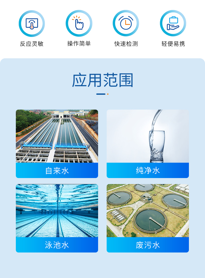 广泛应用于城市供水、食品饮料、环境、医疗、化学、制药、热电、造纸、养殖、生物工程、发酵工艺、纺织印染、石油化工、水处理等领域的水质现场快速检测。