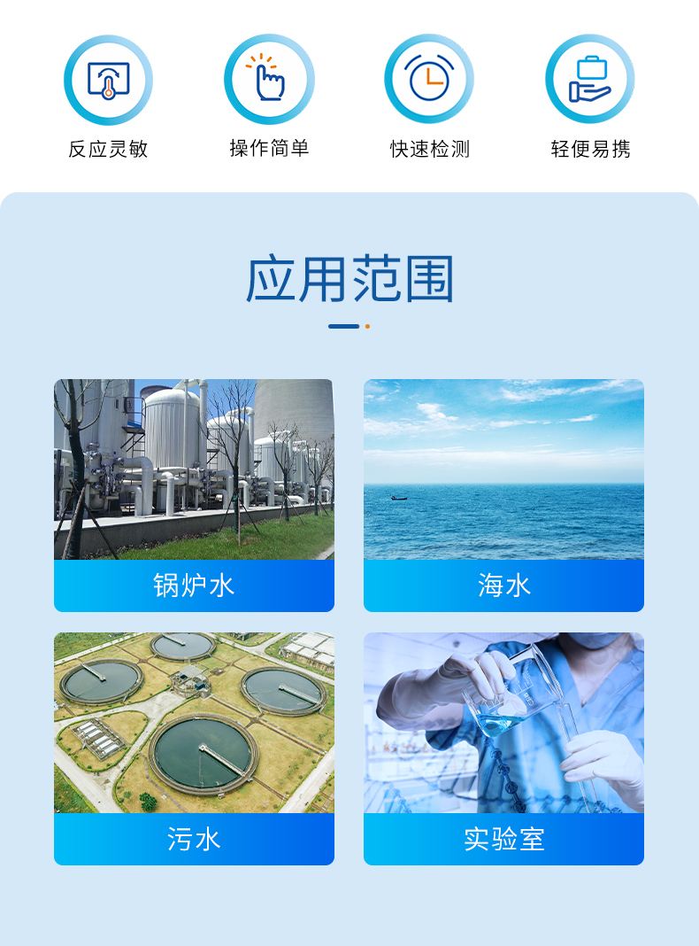 广泛应用于城市供水、食品饮料、环境、医疗、化学、制药、热电、造纸、养殖、生物工程、发酵工艺、纺织印染、石油化工、水处理等领域的水质现场快速检测。