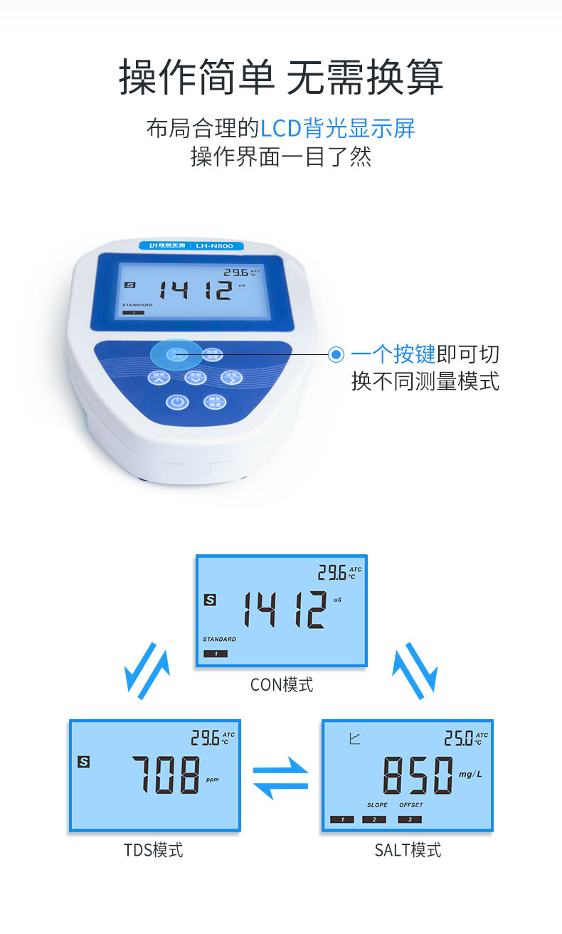 LH-N800台式水质分析仪(电导率/TDS/盐度),精致小巧的设计理念,为您节省空间,给您带来全新感受。清晰易读的数据界面,出色的抗干扰性能,已标定点显示,方便操作,结合高亮度背光照明,用于实验室以及学校日常测量的可靠仪器。