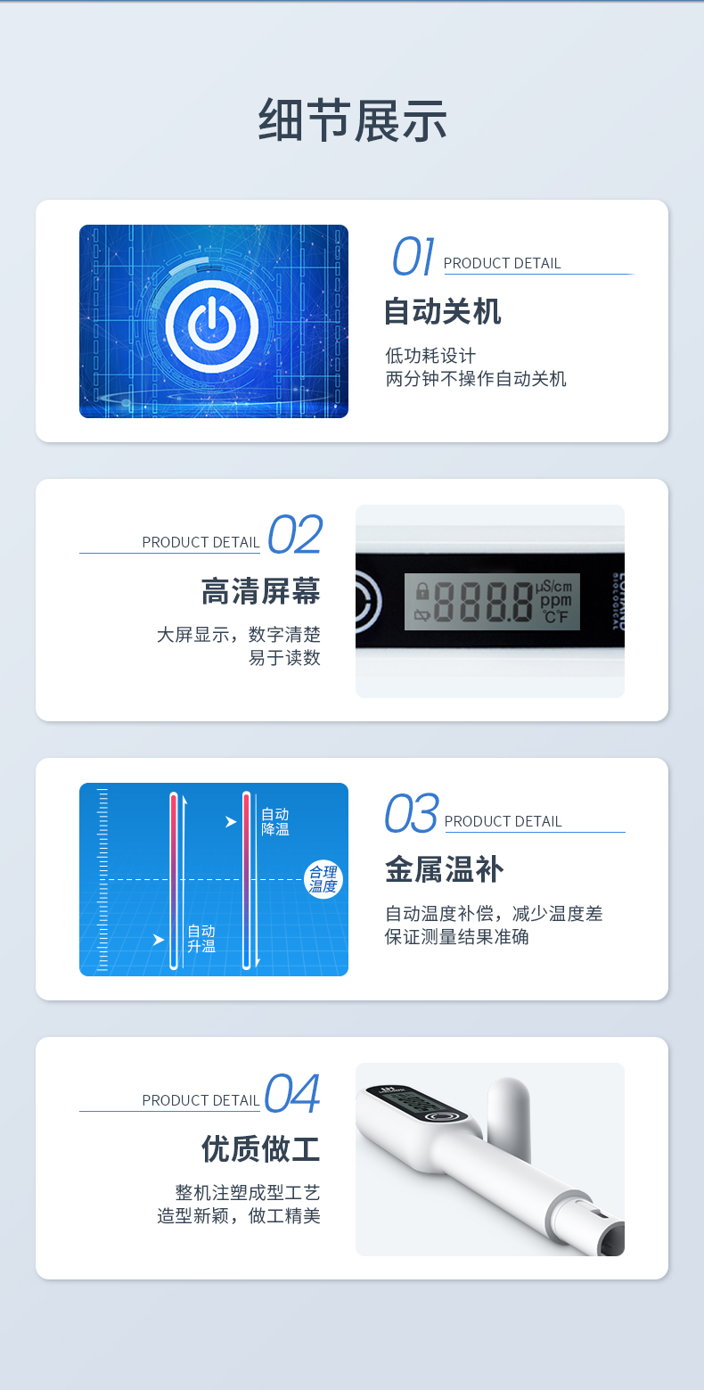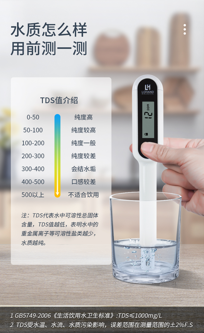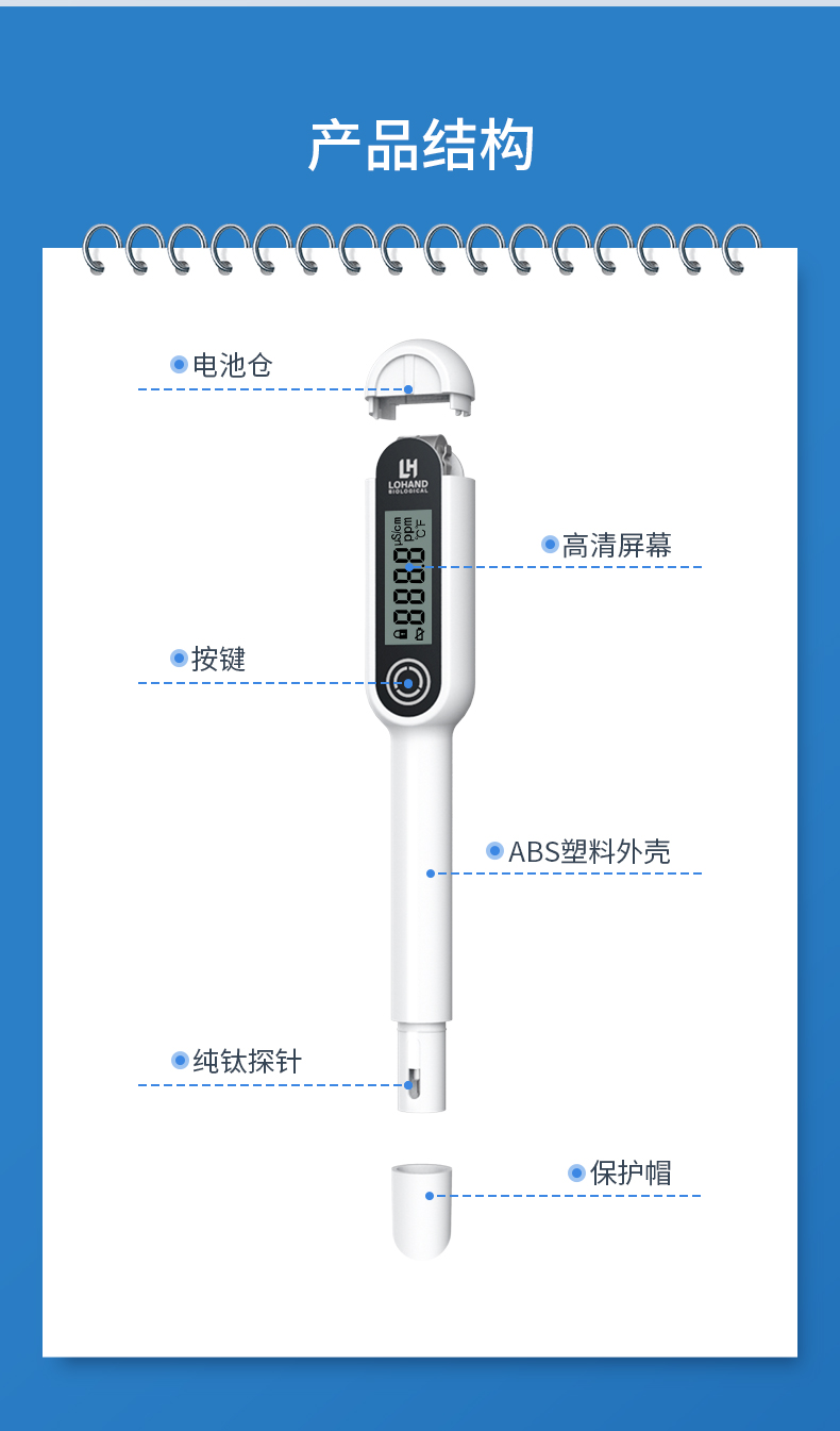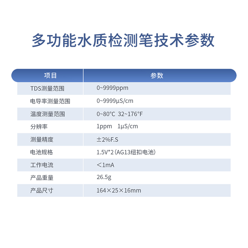 多功能水质检测笔主要用于检测水的TDS(溶解性总固体,单位为ppm)值和电导率(溶液的导电能力,单位为μS/cm)值,判断水的纯净程度,同时兼有检测水温和环境温度的功能。