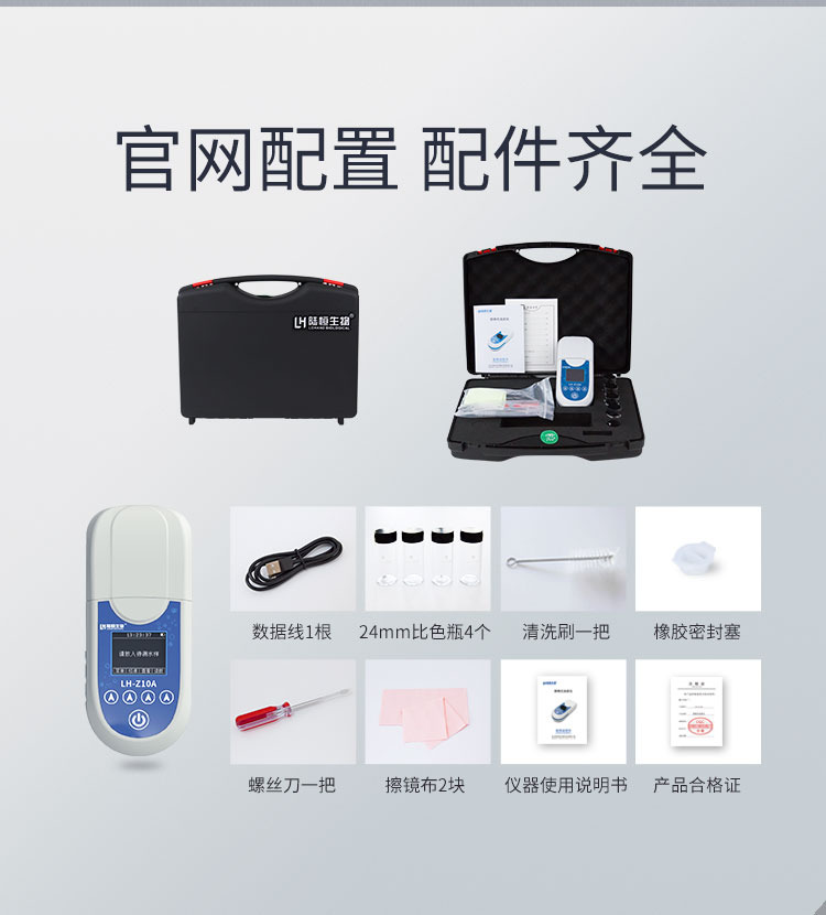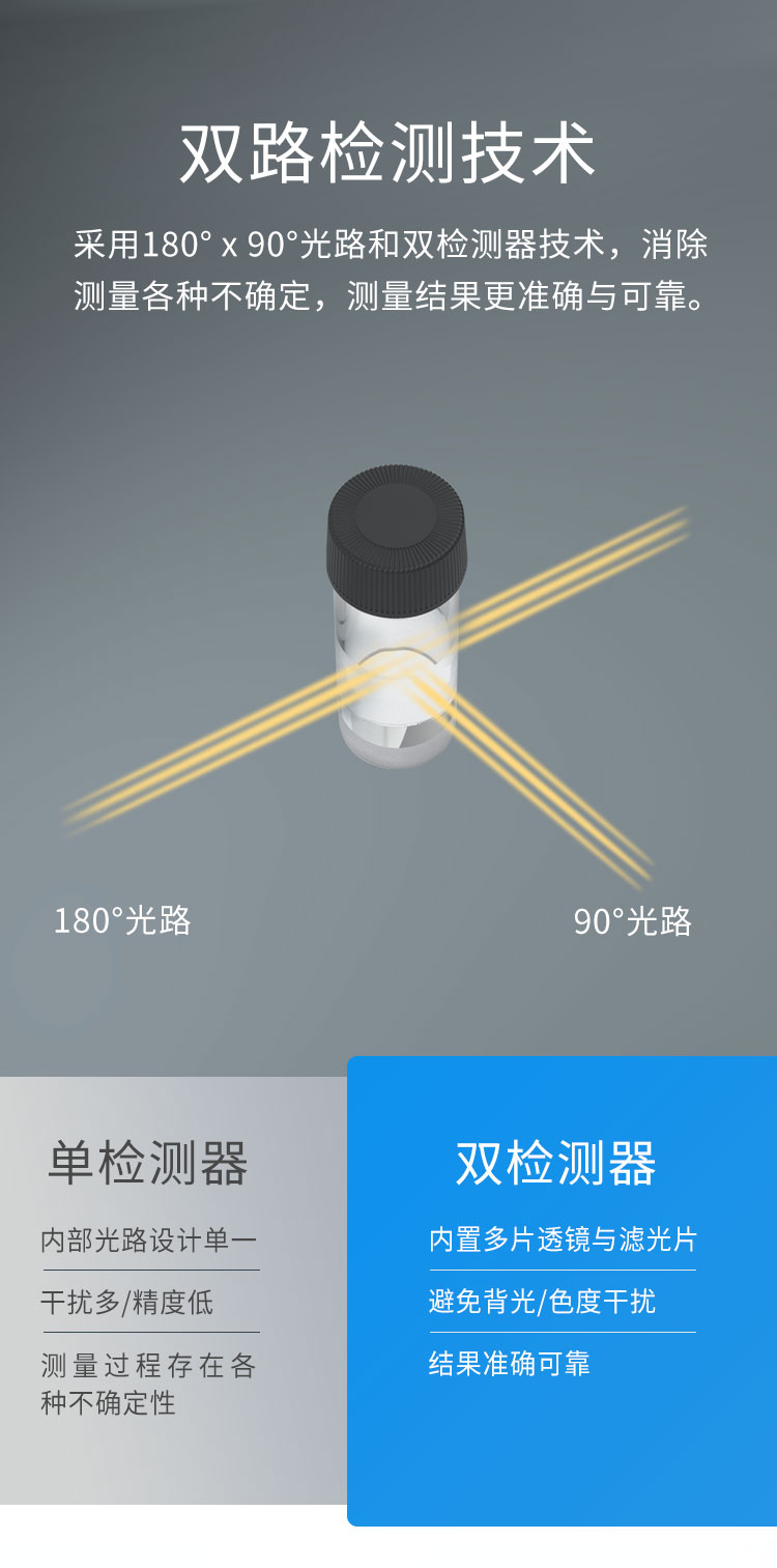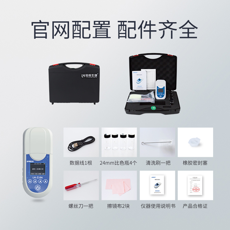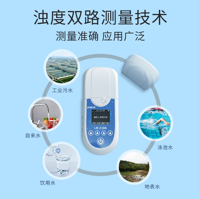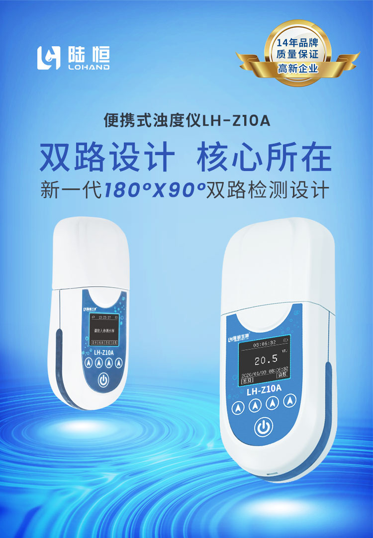 便携式浊度检测仪LH-Z10A结合了散射光法和透射光法,采用了近红外光源,消除色度干扰,符合ISO7027标准。仪器内设置有90°和180°两个检测器,180°检测器接收透射光,90°检测器接收散射光,散射光与透射光强度之比与样品中浊度的浓度成正比,可以通过测定散射光和透射光强度之比从而计算出样品的浊度浓度值。